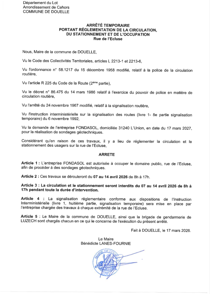 Arrêté temporaire portant à la réglementation de stationnement et de circulation rue de l’Ecluse. Posted on 23 mars 202623 mars 2026