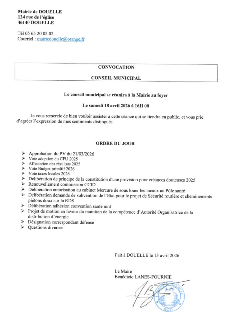 Le conseil municipal se réunira à la Mairie au foyer le samedi 18 avril 2026 à 16h.