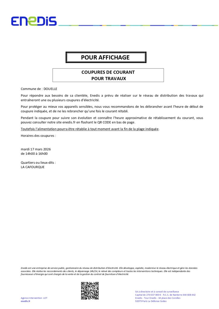 Dans le cadre de travaux, ENEDIS procèdera à une coupure de courant dans le quartier de la Cafourque, le mardi 17 mars 2026, de 14h à 16h. Merci de votre compréhension.