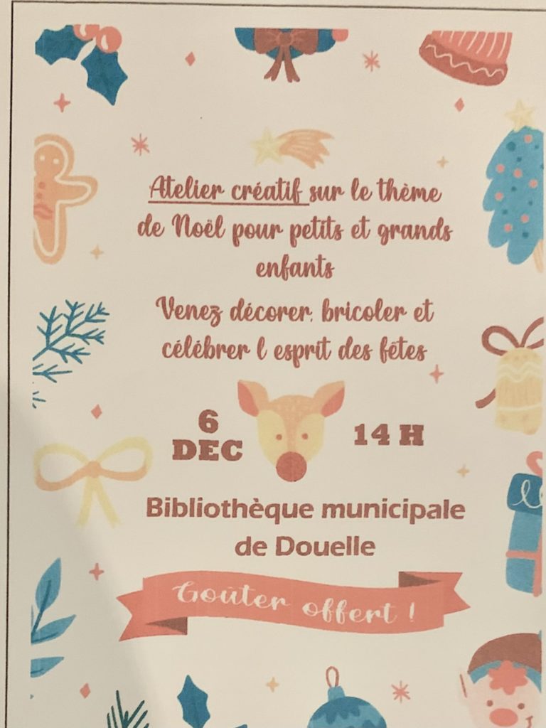 La bibliothèque de Douelle vous propose un atelier créatif sur le thème de Noël, pour petits et grands enfants.