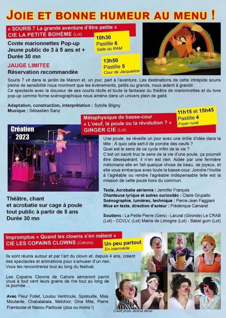 Des contes de marionnettes, du théâtre, du chant, des acrobaties, du théâtre de clown, de la jonglerie de la danse, ou encore de la poésie seront au rendez-vous !