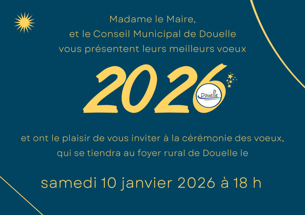 Madame le Maire, et le Conseil Municipal de Douelle vous souhaitent une bonne année 2026, et vous invitent à la cérémonie des vœux, qui se tiendra au foyer rural de Douelle, le samedi 10 janvier 2026 à 18h.