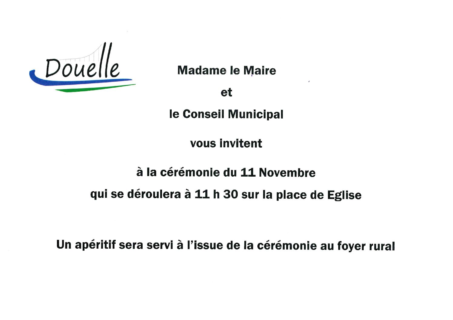 DouelleMadame le Maire et le conseil municipal vous invitent à la cérémonie du 11 novembre à 11 h 30, place de l'Église. Un apéritif sera servi au foyer à l'issue